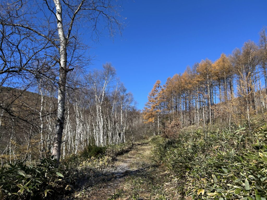 左にはシラカバ、右にはカラマツの紅葉が青空に映えています