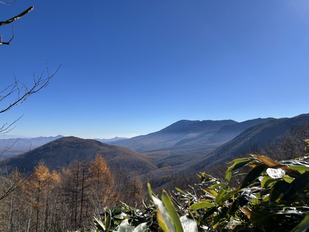 昼食と景色を楽しんだら、下方に見える尾根を下って戻ります(左側には湯ノ丸山、中央は烏帽子岳)