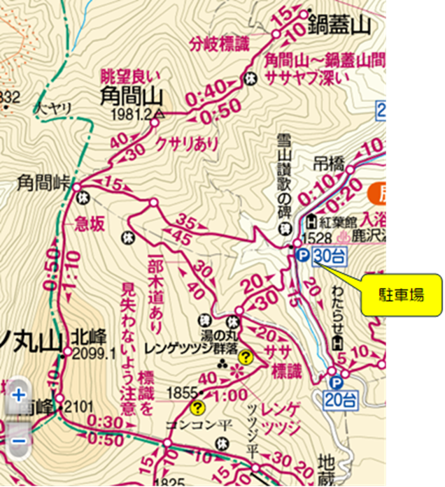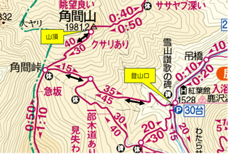 登山口から角間山山頂までは、往復約3時間くらいです。(下図の黒矢印を参考にしてください)